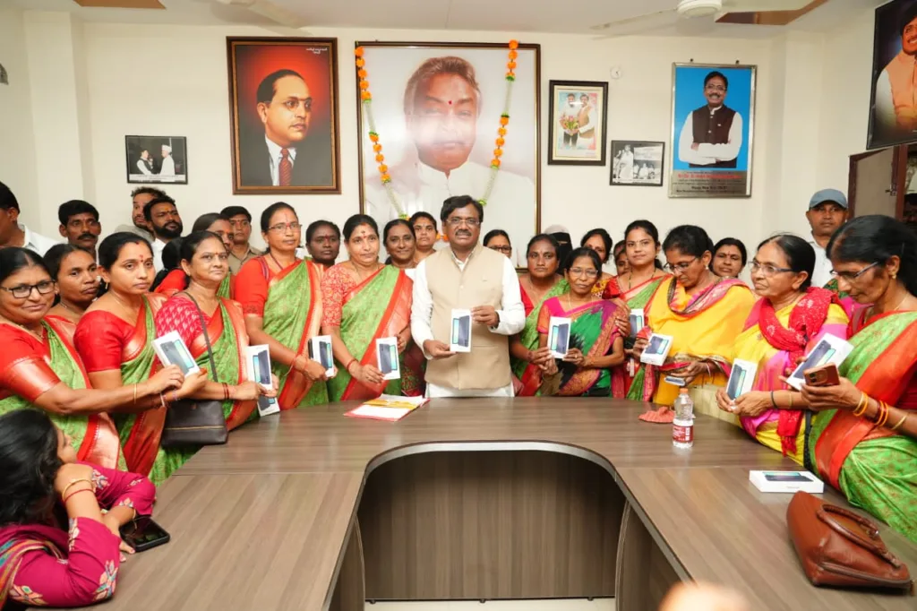 చెన్నూరు ఎమ్మెల్యే క్యాంపు కార్యాలయంలో అంగన్వాడీ టీచర్లకు రాష్ట్ర ప్రభుత్వం అందిస్తున్న సెల్ ఫోన్లను పంపిణీ