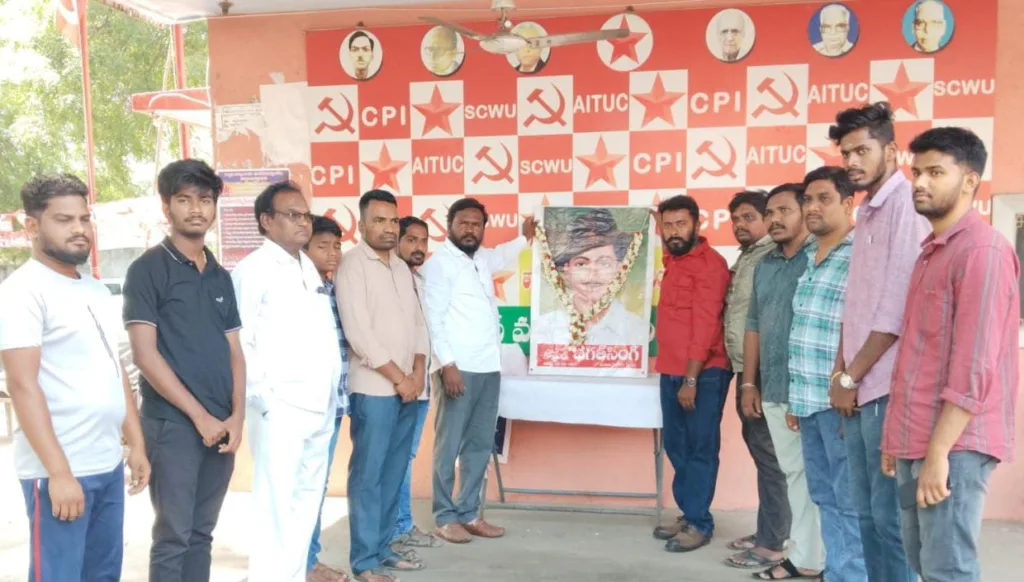 స్వాతంత్ర సమరయోధుడు కామ్రేడ్ సర్దార్ భగత్ సింగ్ 95వ వర్ధంతి సందర్భంగా స్థానిక భాస్కరరావు భవన్లో సోమవారం నాడు అఖిల భారత విద్యార్థి -యువజన సమాఖ్య (AISF-AIYF) రామగుండం నగర సమితి ఆధ్వర్యంలో సర్దార్ భగత్ సింగ్ చిత్రపటానికి పూలమాలవేసి వర్ధంతిని ఘనంగా నిర్వహించడం జరిగింది. ఈ సందర్భంగా AIYF జిల్లా కార్యదర్శి కార్పొరేటర్ మార్కపురి సూర్య AISF జిల్లా కార్యదర్శి రేణుకుంట్ల ప్రీతం మాట్లాడుతూ “స్వాతంత్ర సంగ్రామంలో ఉరితాడును ముద్దాడిన యోధుడు సర్దార్ భగత్ సింగ్ అని అతని జీవితం ఎంతోమంది యువకులకు ఆదర్శమని వారన్నారు. 23 ఏళ్ల వయసులోనే బ్రిటిష్ పాలకుల వెన్నులో వణుకు పుట్టించే విధంగా పార్లమెంట్ పై బాంబు వేసి తన స్వతంత్ర కాంక్షను తెలియజేసిన ధీరుడు కామ్రేడ్ సర్దార్ భగత్ సింగ్ అని అంతేకాకుండా స్వతంత్ర సంగ్రామంలో లాలా లజపతిరాయ్, గాంధీజీలు చేసే ఉద్యమానికి ఆకర్షితుడైన భగత్ సింగ్ విద్యార్థి దశనుండే స్వతంత్ర సంగ్రామంలో పాల్గొనడం తో పాటు బ్రిటిష్ పాలకులను గడగడలాడించిన ధీరుడు భగత్ సింగ్ అని అన్నారు .